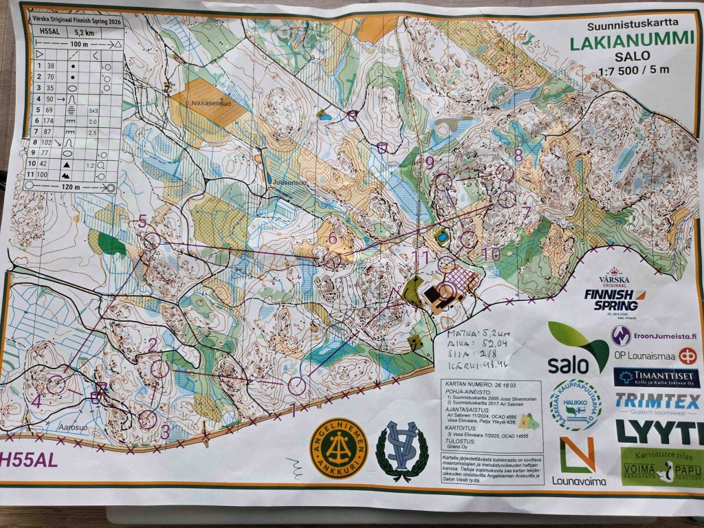 Kevään suurin suunnistuskilpailu Finnish spring kisattiin Angelniemen Ankkurin järjestämänä Salossa. Lauantaina on pitkän matkan henkilökohtainen kisa ja sunnuntaina viestit. Lauantain kisaan oli ilmoittautunut 1881 kisaajaa, lisäksi kuntosuunnistajat. Rykmenttiläisiä oli lauantaina mukana tusina. Maasto oli länsiosaltaan polkuja, teitä, harvennuksia ja hakkuitakin sisältävä, itäosaltaan vaativampaa kallioista alueen tyypillistä maastoa. Mäet olivat jyrkkärinteisiä. Suunnistuksellisesti vaihtelevat radat, ykköslähdöstä toki vaikeampaa. Huipuilla oli 1:15000 mittakaavan kartalla erittäin pitkät matkat, naisten pääsarjassa vain yksi pääsi alle 1.40 ajan. Rykmenttiläisistä parhaiten menestyi Joko Malinen, joka otti voiton H70-sarjassa, nyt toki vain 15 sek. erolla. Hän on keväällä kulkenut voitosta voittoon. Häntä säesti hyvin samassa sarjassa Arto Niemi kolmossijallaan. Samuli Kyyrönen oli neljäs H55A-sarjassa. Mika Loukkalahti oli kakkonen heikompitasoisessa H55AL-sarjassa. Oliver Laapas oli sijalla 7 tiukassa H16-sarjassa.