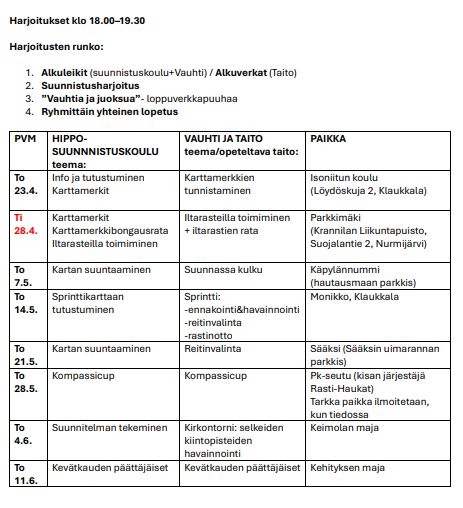 Kevätkausi 23.4.-11.6. (8 kertaa) Suunnistusharjoituksia ulkona vaihtelevissa paikoissa